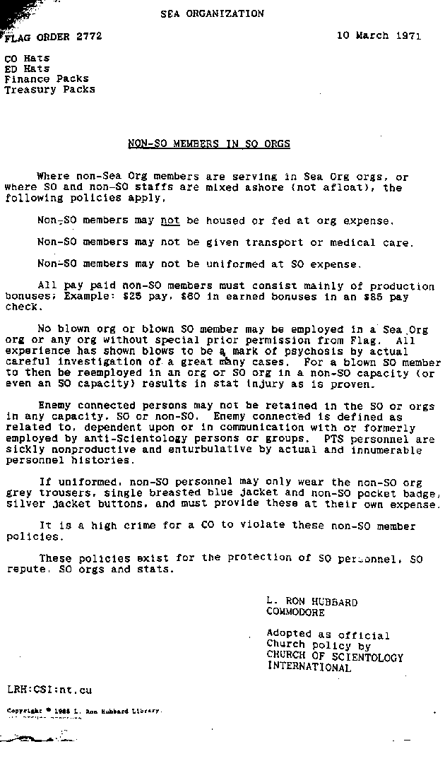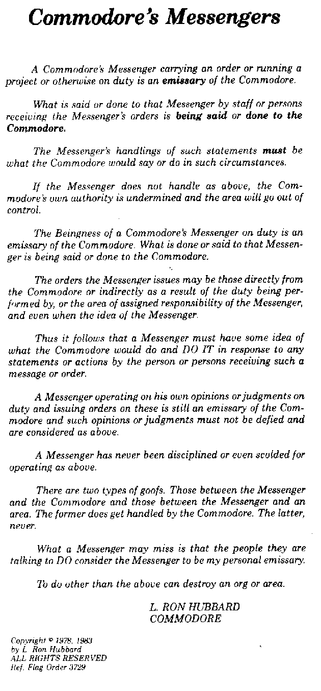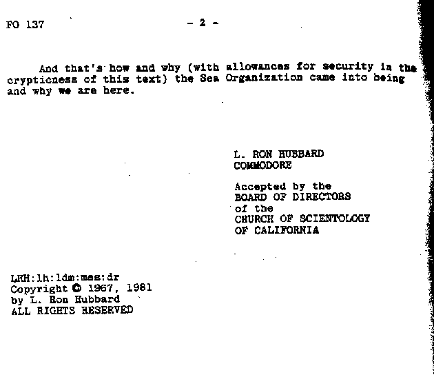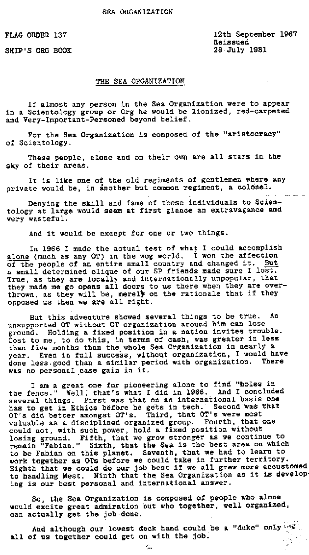 - The Sea Organization (Flag order 137 from 1967 (reissued 1981))