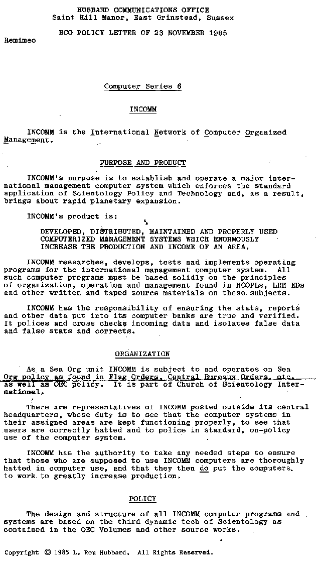 INCOMM is subject to and operates on Sea Org policy as found in Flag