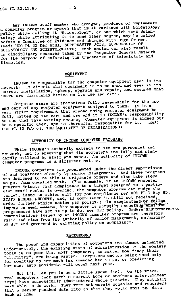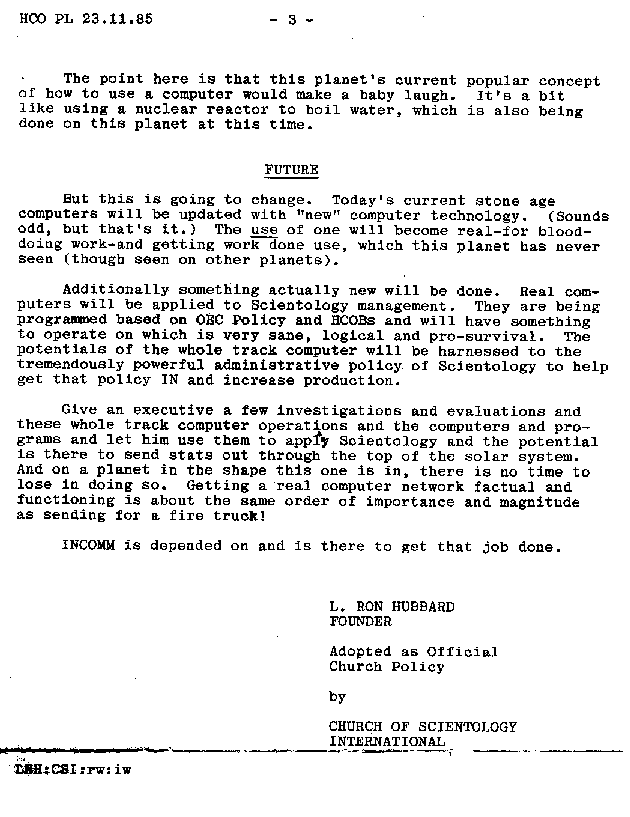 The documents from HCOPL 23 November 1985 in Computer Series 6 present