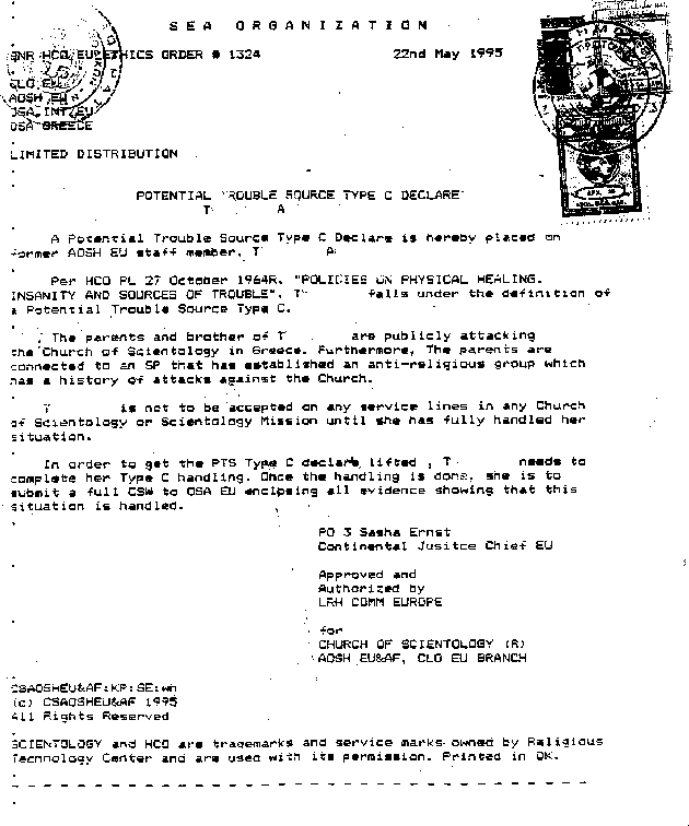 - SeaOrg: PTS Declare (22 May 1995)